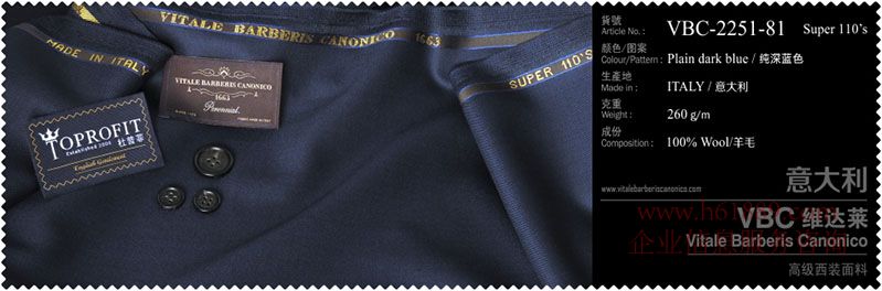 杜普菲:100%進(jìn)口面料、生產(chǎn)地:意大利、顏色圖案:純深藍(lán)色、成份:100%羊毛、VBC維達(dá)菜:高級(jí)西裝面料
