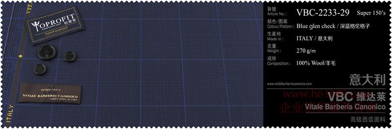 杜普菲:100%進(jìn)口面料、生產(chǎn)地:意大利、顏色圖案:深藍(lán)格倫格子、成份:100%羊毛、VBC維達(dá)菜:高級(jí)西裝面料