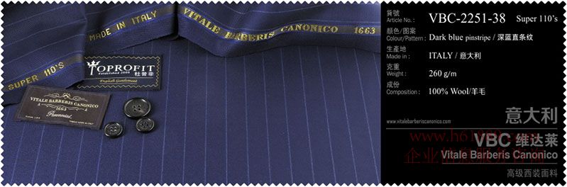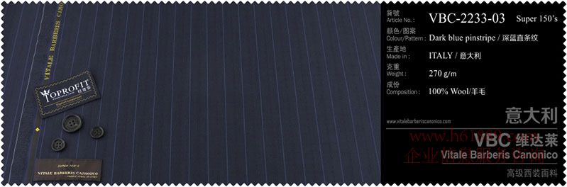 杜普菲:100%進(jìn)口面料、生產(chǎn)地:意大利、顏色圖案:深藍(lán)直條紋、成份:100%羊毛、VBC維達(dá)菜:高級(jí)西裝面料