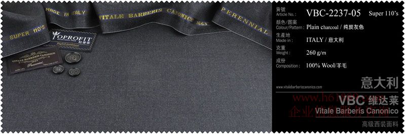 杜普菲:100%進(jìn)口面料、生產(chǎn)地:意大利、顏色圖案:純炭灰色、成份:100%羊毛、VBC維達(dá)菜:高級(jí)西裝面料