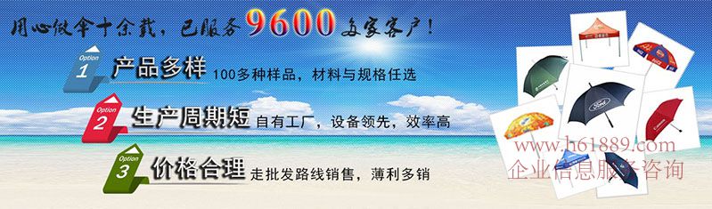 雨花石傘業(yè)有限公司是一家專注于雨傘、廣告?zhèn)?span style="font-family: 宋體,SimSun; font-size: 18px;">、戶外太陽傘、廣告帳篷、禮品傘、等產品設計、制作、銷售為一體的綜合性企業(yè)、憑借著質量可靠、價格實惠、服務周到等優(yōu)勢在市場上擁有一批穩(wěn)定的客戶