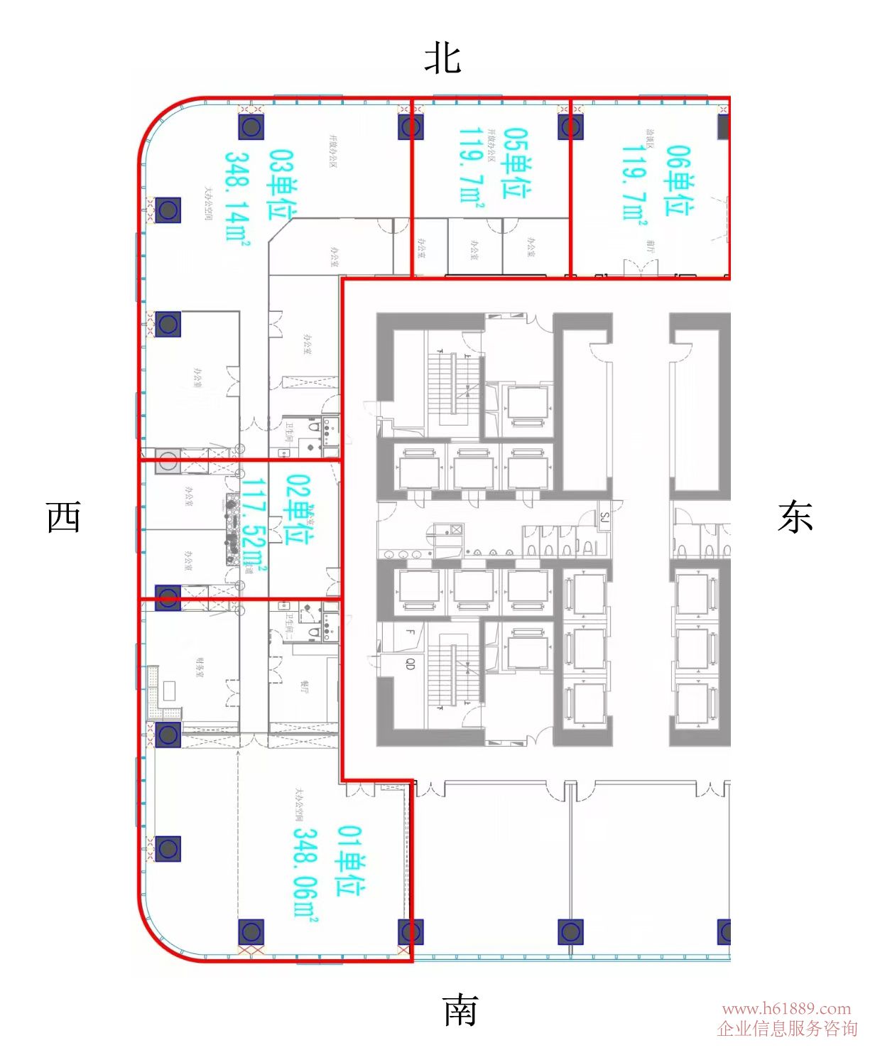 租售面積:120㎡、150㎡、171㎡、222㎡、260㎡、360、456㎡、520㎡、980㎡、1200㎡、1600㎡、整層:2200㎡、連層:面積任意組合
