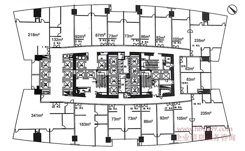 戶型面積:50平米、73平米、86平米、92平米、132平米、183平米、218平米、235平米、341平米、整層面積:2647平米、面積任意組合