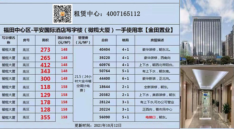 橄欖大廈(平安國際酒店)租賃中心電話:400 7165 112