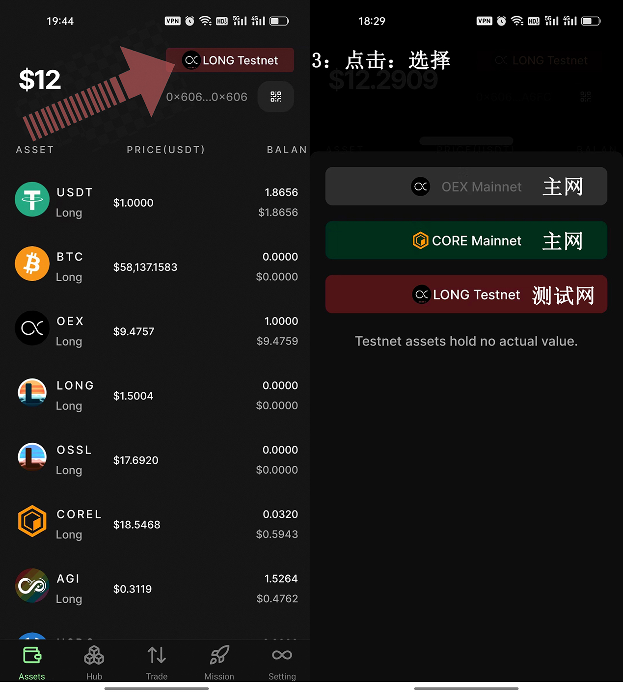 3:點(diǎn)擊:選擇:OEX主網(wǎng):CORE主網(wǎng):OEX 測(cè)試網(wǎng)