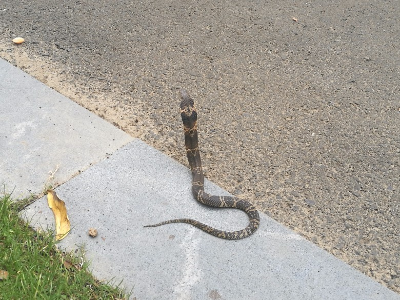 眼鏡蛇被驚擾后:立刻把頭抬起、直立起身體看著劉先生、劉先生不敢冒然上前、趕緊躲開(kāi)了