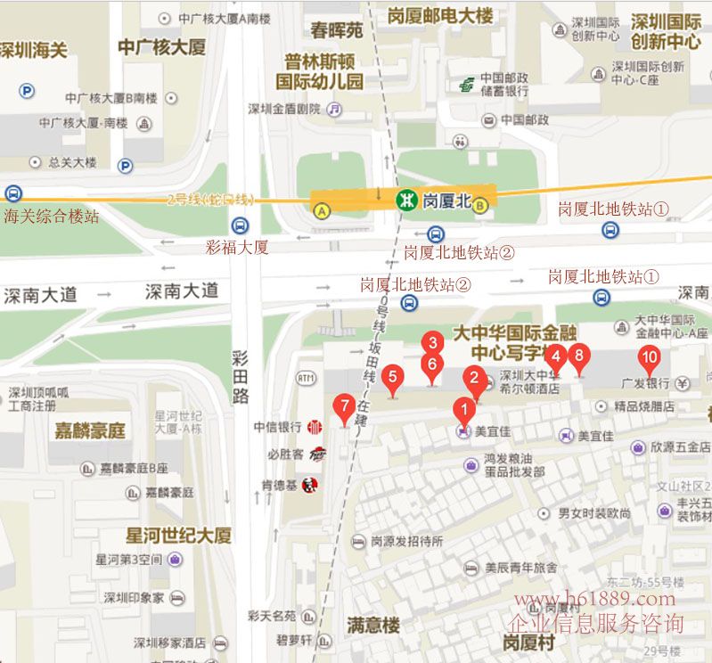 崗廈北地鐵站:深圳之眼 地鐵:2號線【蛇口線】8號線【鹽田線】10號線【坂田線】11號線【深圳地鐵機(jī)場快線】14號線【東部快線】、地鐵主干道:臨靠深南大道、彩田路、北環(huán)大道等城市主干道、靠深南大道、彩田路、北環(huán)大道等城市主干道