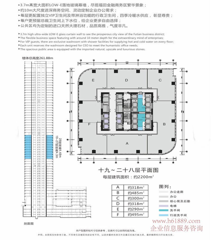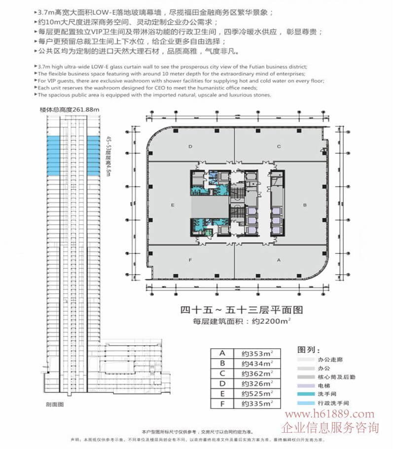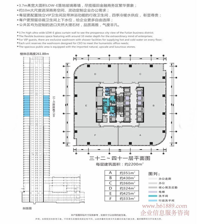 租售面積:115㎡、156㎡、192㎡、259㎡、299㎡、326㎡、361㎡、433㎡、525㎡、680㎡、760㎡、829㎡、903㎡、1057㎡、1275㎡、1345㎡、1419㎡、1682㎡、1876㎡、433㎡、標準層面積:約2100㎡、面積自由組合