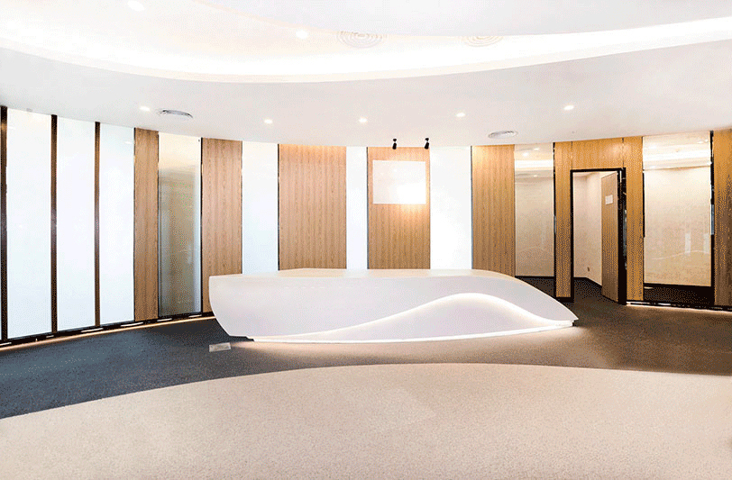 墻面鑲嵌約14萬顆呼吸式LED燈、公共裝修用料均為高檔進口石材、每層獨立配置帶淋浴功能行政衛(wèi)生間、每戶預留總裁洗手間位、提供實時溫水洗手、高科技智能管理系統(tǒng)