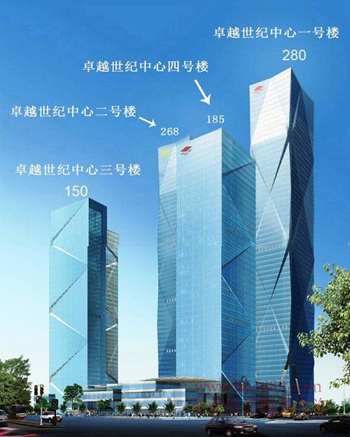 樓高:1號樓、280米。2號樓、268米。3號樓、150米。4號樓、185米