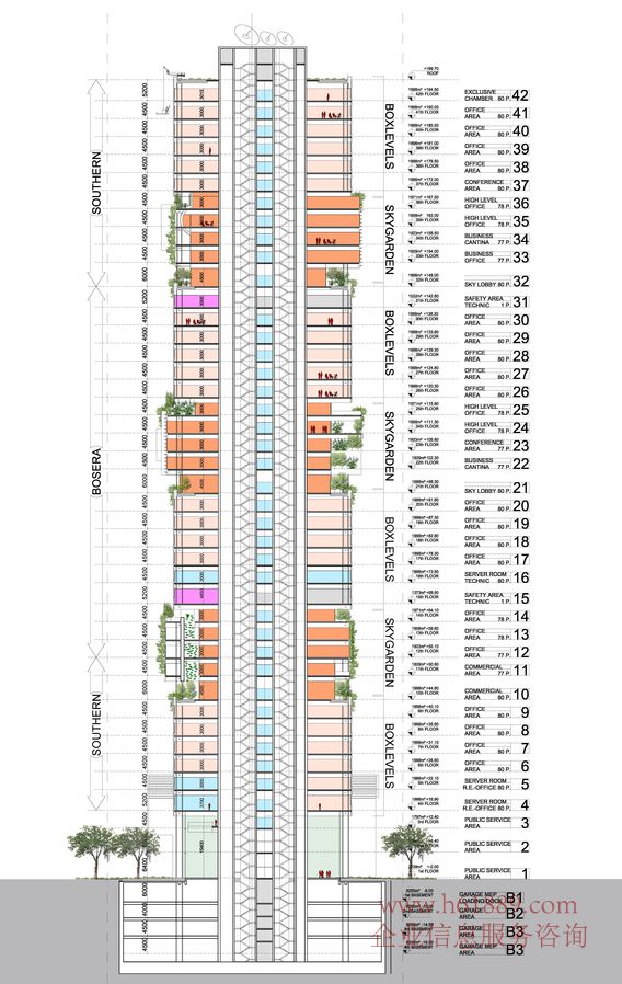 博時(shí)基金大廈(南方博時(shí)基金大廈)在裙樓之上、大廈塔樓的設(shè)計(jì)將垂直綠化融合、外表獨(dú)特、同時(shí)為新的工作方式和可持續(xù)提供了可行方案、從縱向看、大廈每5、6層便形成一個(gè)不同的分區(qū)、并如此向上重復(fù)3、4次、其中、“盒子”分區(qū)以每6層為單元、每層相同、而“空中花園”分區(qū)以每5層為單元、但這5層卻都不盡相同