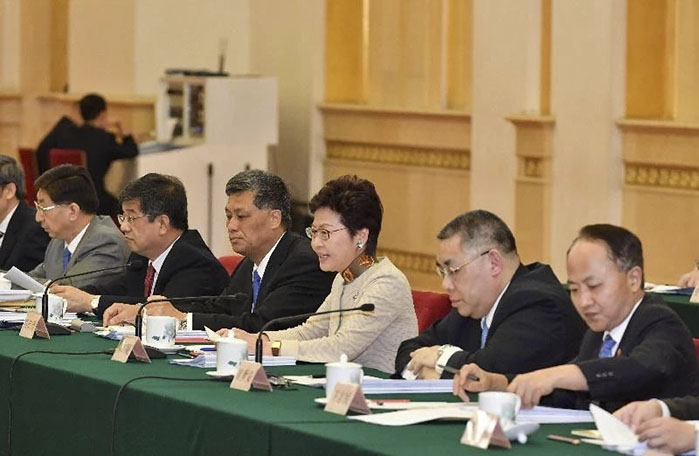 香港行政長官林鄭月娥2019年11月6日下午在北京釣魚臺國賓館以成員身分出席由國務(wù)院副總理韓正主持召開的粵港澳大灣區(qū)建設(shè)領(lǐng)導(dǎo)小組會議,討論部署下一階段重點工作。政制及內(nèi)地事務(wù)局局長聶德權(quán)和行政長官辦公室主任陳國基列席會議。