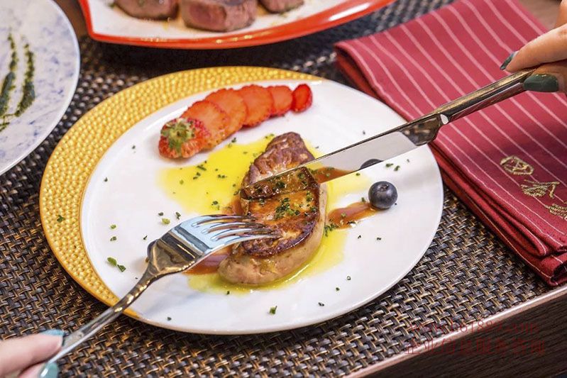 鐵板鵝肝:鵝肝口感相當(dāng)細(xì)膩,放入嘴中就迅速融化,就像“夢中情人的香吻”滑過舌尖,配上切好的草莓,剛好可以解膩。