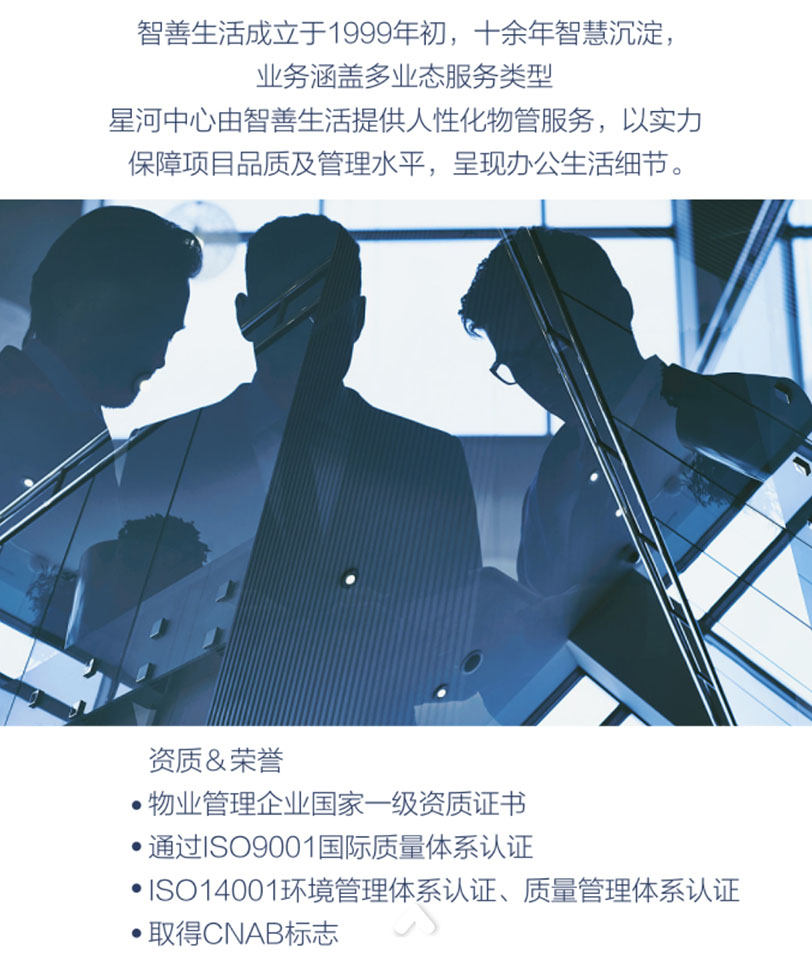 深圳星河智善生活股份有限公司(智善生活):智善生活成立于1999年初、十余年智慧沉淀、業(yè)務(wù)涵蓋多業(yè)態(tài)服務(wù)類型、?星河中心【星河發(fā)展中心】由智慧生活提供人性化物業(yè)服務(wù)、以實(shí)力保障項(xiàng)目品質(zhì)及管理水平、呈現(xiàn)辦公生活細(xì)節(jié)、資質(zhì)+榮譽(yù)、物業(yè)管理企業(yè)國(guó)家一級(jí)資質(zhì)證書(shū)、通過(guò)ISO9001國(guó)際質(zhì)量體系認(rèn)證、ISO14001環(huán)境管理體系認(rèn)證、質(zhì)量管理體系認(rèn)證、取得CNAB標(biāo)志