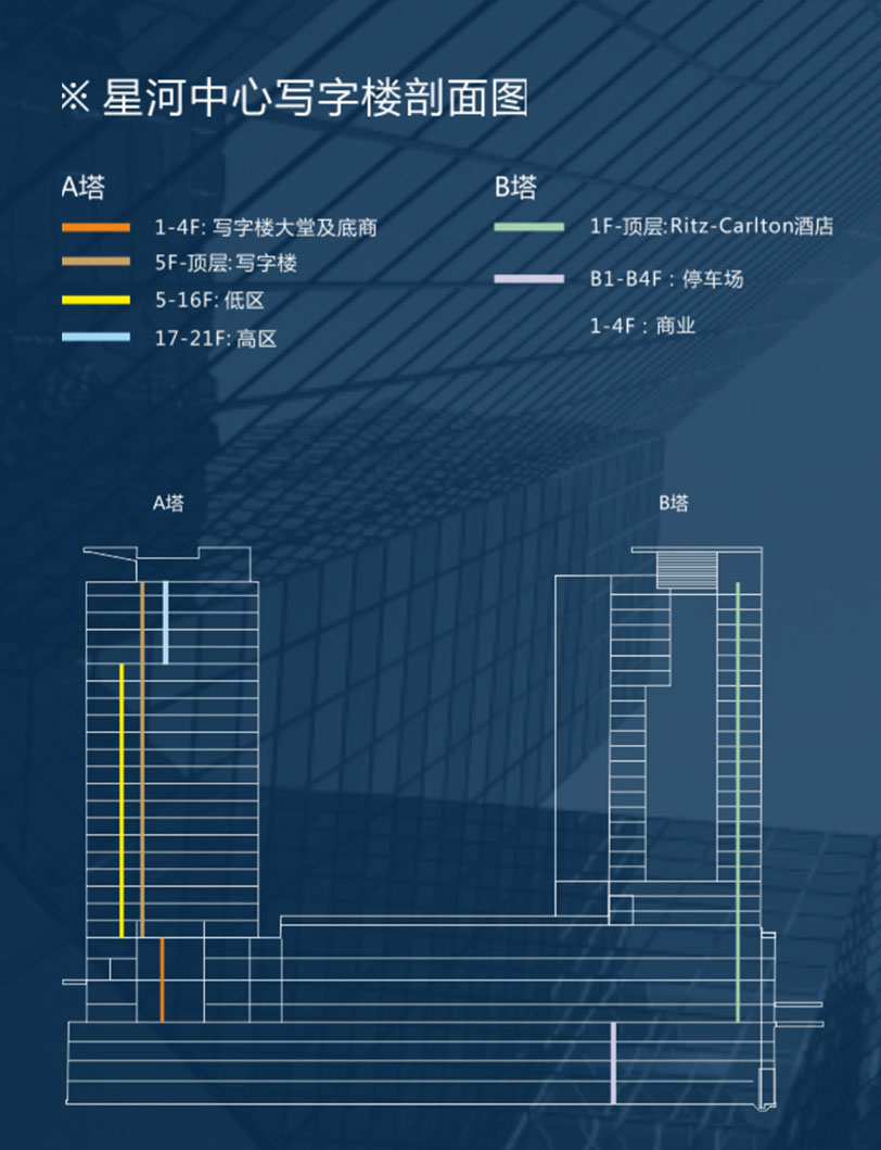 B座:1到頂層:Ritz Carliton、B1到B4:停車(chē)場(chǎng) 1到4層:商業(yè)