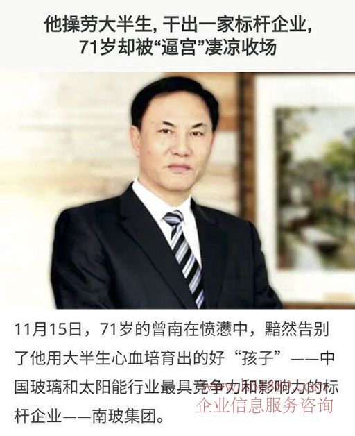 2016年11月15日,曾南在憤懣中告別了他用大半生心血培育出的好“孩子”——中國玻璃和太陽能行業(yè)最具競爭力和影響力的標(biāo)桿企業(yè)——南玻集團。