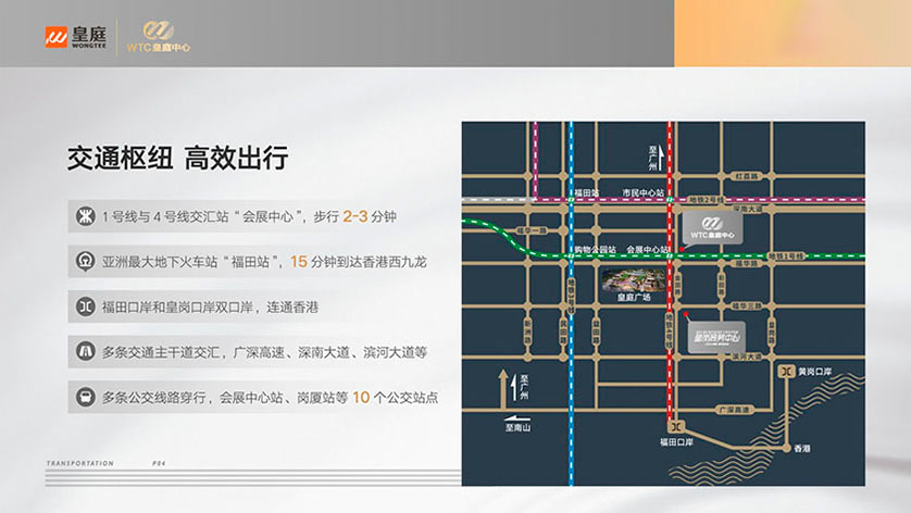 亞洲最大地下火車站:福田站、15分鐘到達香港西九龍、福田口岸和皇崗口岸雙口岸、連通香港、多條主干道交匯、廣深高速、深南大道、濱河大道等、多條公交線路穿行、會展中心站、崗廈站等10個公交站點