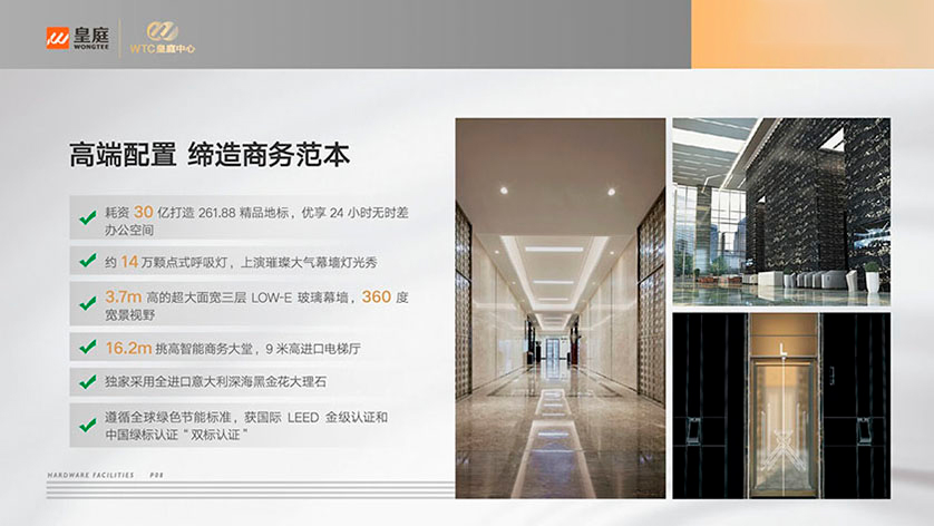 皇庭中心【皇庭中心大廈】硬件設(shè)施:高端配置、締造商務(wù)范本、耗資30億打造261.88精品地標,優(yōu)享24小時無時差辦公空間、約14萬顆點式呼吸燈,上演璀璨大氣幕墻燈光秀、3.7m高的超大面寬三層LOW-E、玻璃幕墻,360度寬景視野、16.2m挑高智能商務(wù)大堂,9米高進口電梯廳、獨家采用全進口意大利深海黑金花大理石、道循全球綠色節(jié)能標準,獲國際LEED金級認證和 中國綠標認證“雙標認證