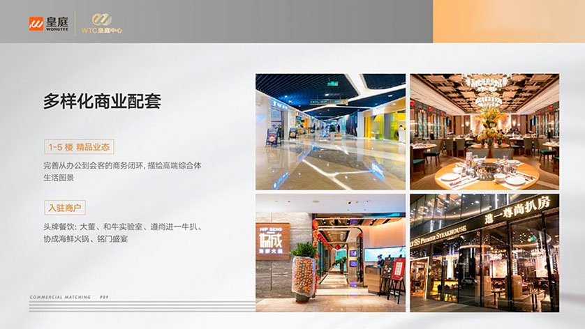 皇庭中心【皇庭中心大廈】商業(yè)配套:多樣化商業(yè)配套、1-5樓、精品業(yè)態(tài)、完善從辦公到會客的商務(wù)閉環(huán)、描繪高端綜合體、生活圖景、入駐商戶、頭牌餐飲:大董、和牛實驗室、遵尚進一牛扒、協(xié)成海鮮火鍋、銘門盛宴