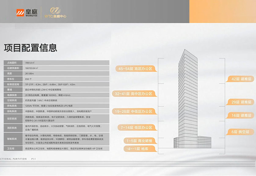 皇庭中心【皇庭中心大廈】地標建筑:集團耗資30億、打造深圳首座世界級標準的寫字樓、總建筑面積:166150.64m1:樓高:約261.88m :層數(shù):54層