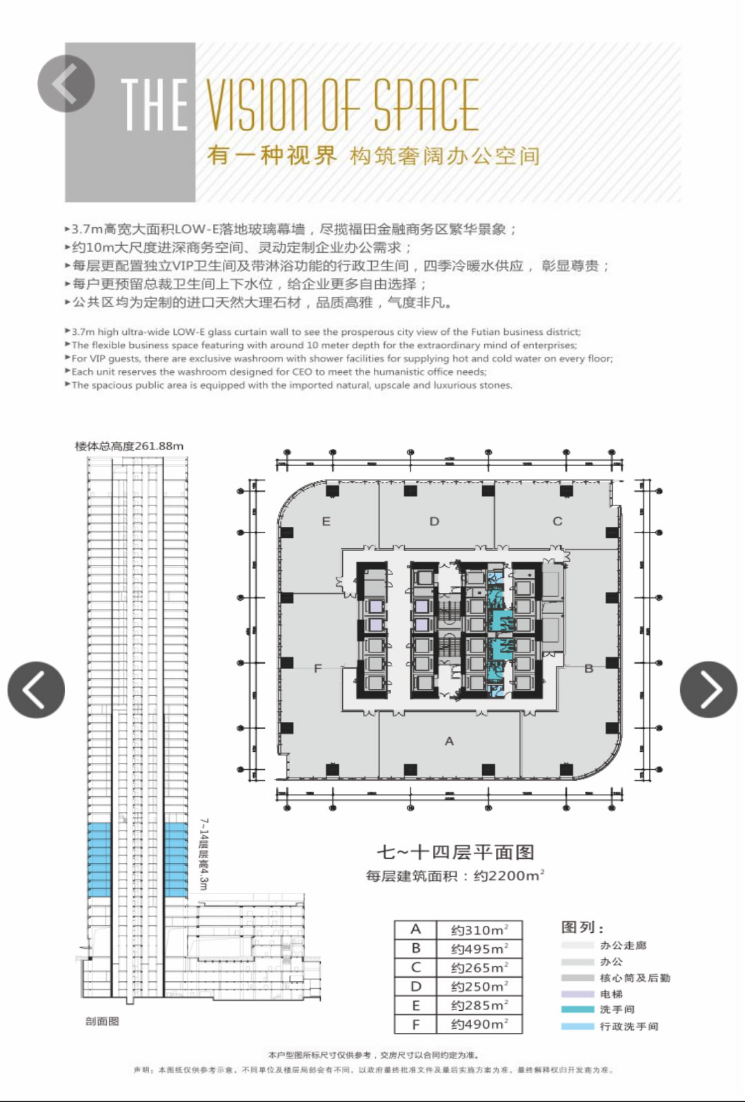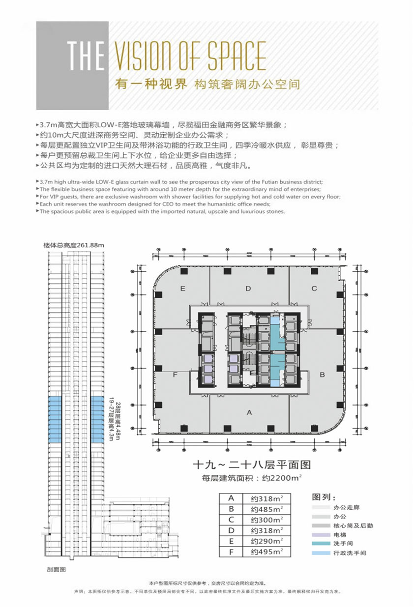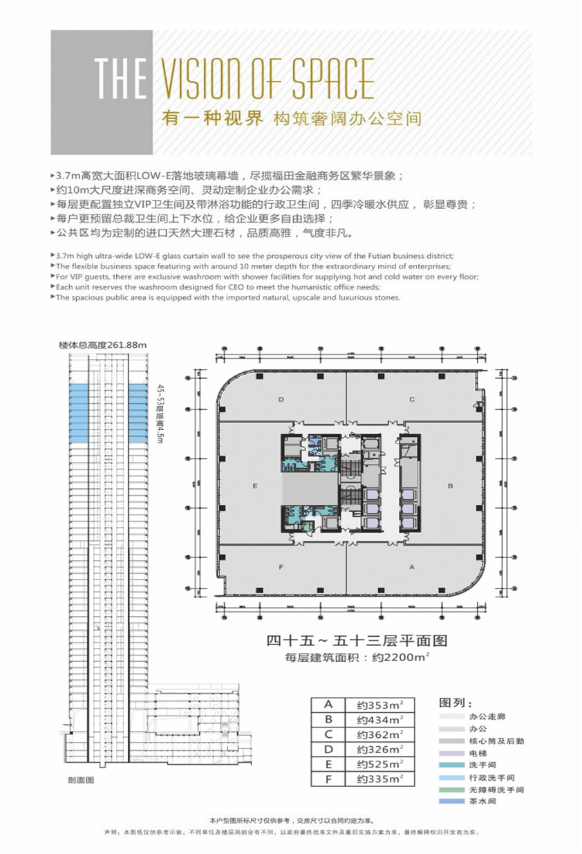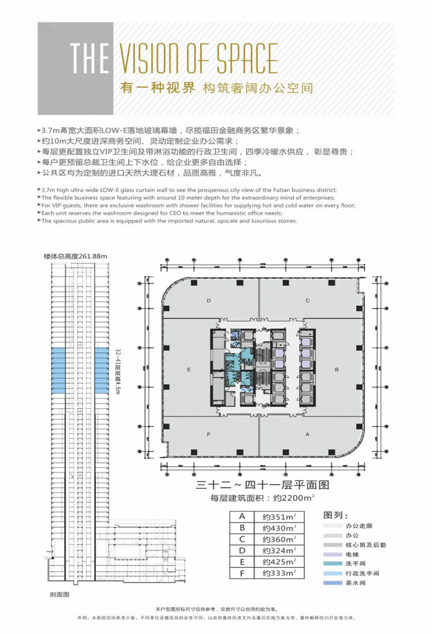 租售面積:115㎡、156㎡、192㎡、259㎡、299㎡、326㎡、361㎡、433㎡、525㎡、680㎡、760㎡、829㎡、903㎡、1057㎡、1275㎡、1345㎡、1419㎡、1682㎡、1876㎡、433㎡、標準層面積:約2100㎡、面積自由組合