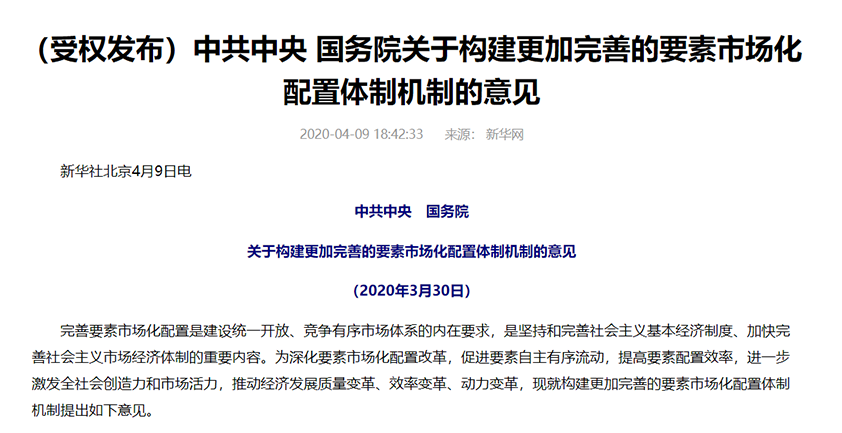 出了一份文件《中共中央、國(guó)務(wù)院關(guān)于構(gòu)建更加完善的要素市場(chǎng)化配置體制機(jī)制的意見(jiàn)》。