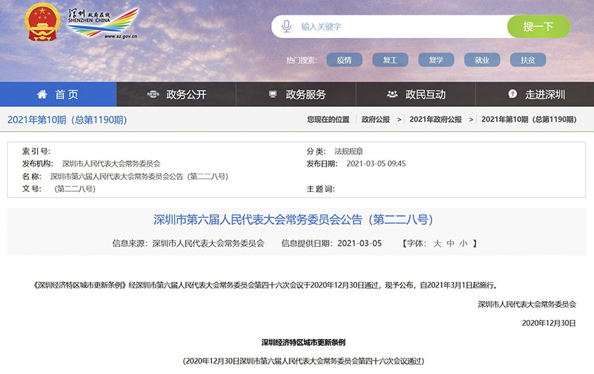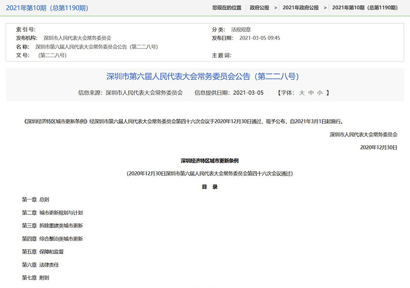 2020年12月30日《深圳經(jīng)濟(jì)特區(qū)城市更新條例》經(jīng)深圳市第六屆人民代表大會常務(wù)委員會第四十六次會議表決通過。