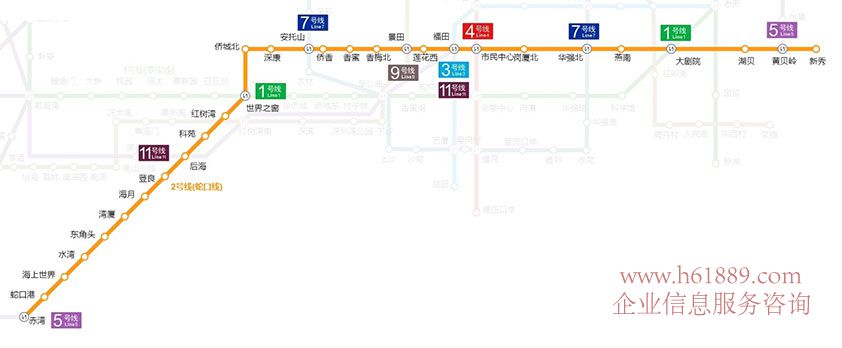 截至2019年1月,深圳地鐵2號線西起南山區(qū)赤灣站,途經(jīng)福田區(qū),東至羅湖區(qū)新秀站,呈S形向東-西南走向