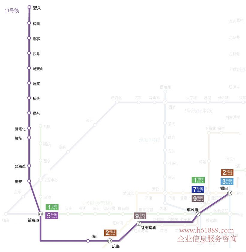 中文名:深圳地鐵11號線、外文名:Shenzhen Metro Line 11、標志色:紫紅色