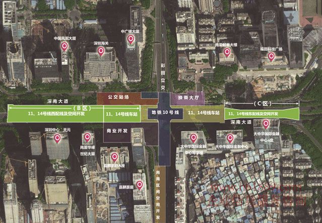 作為福田CBD的重點工程,崗廈北綜合交通樞紐將是軌道交通和城市空間開發(fā)完美結合的超級工程,其地下空間將向西連通市民中心、向南連通連城新天地。同時深圳中心綜合體也預留了聯(lián)通接口,天元和金地中心將坐享巨無霸超級樞紐帶來的高效與便捷