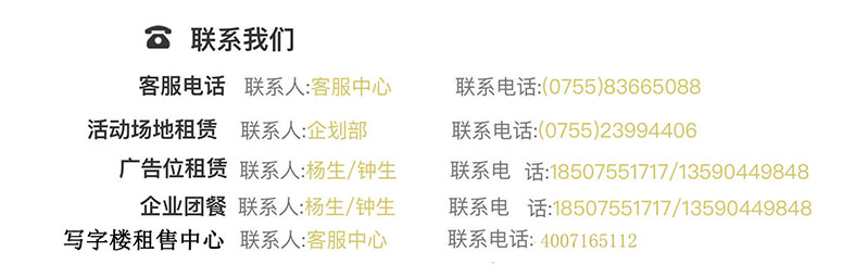活動(dòng)場(chǎng)地租賃 | 聯(lián)系人 | 企劃部 | 聯(lián)系電話 | 0755-23994406 | |