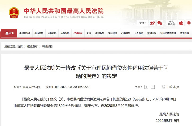 《最高人民法院關(guān)于修改〈關(guān)于審理民間借貸案件適用法律若干問(wèn)題的規(guī)定〉的決定》已于2020年8月18日由最高人民法院審判委員會(huì)第1809次會(huì)議通過(guò),現(xiàn)予公布,自2020年8月20日起施行。