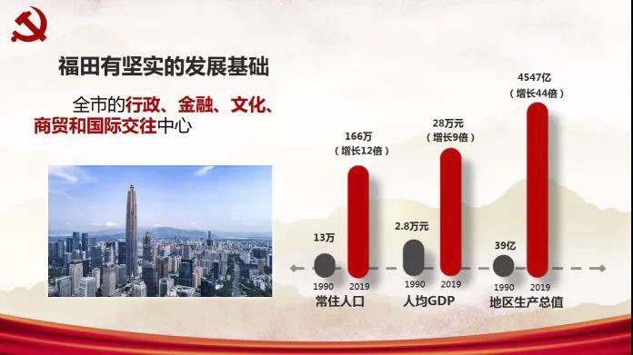 福田區(qū)常住人口 :1990年只有13萬人,2019年已經(jīng)達到了166萬人;福田的GDP :1990年只有39億元,2019年已經(jīng)達到了4500多億元;人均GDP :1990年只有2.8萬元,2019年已經(jīng)達到了28萬元