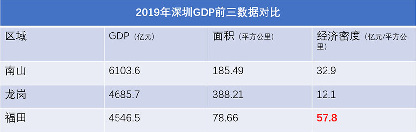 2019年福田區(qū)GDP總量為4546.5億元,居深圳各區(qū)中第三位,但是,福田區(qū)每平方公里GDP(即地均GDP)達(dá)到了57.8億元