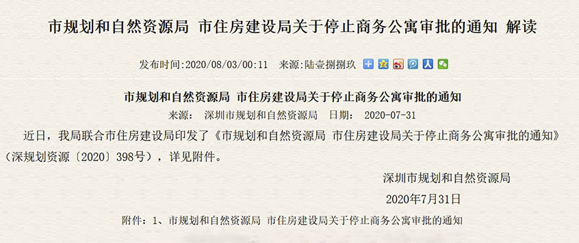 今年7月15日,深圳開啟最嚴(yán)限購,一個(gè)月后,深圳市規(guī)劃和自然資源局、市住建局聯(lián)合發(fā)出通知,要求在全市范圍內(nèi)(含深汕特別合作區(qū))停止新的商務(wù)公寓項(xiàng)目的規(guī)劃審批和用地出讓方案審批