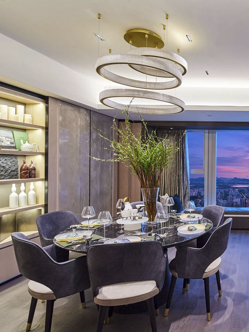 在餐飲家宴體系空間,大理石餐桌與藝術(shù)裝置背景墻相得益彰,中式圓桌彰顯大家族氣派與人文溫情