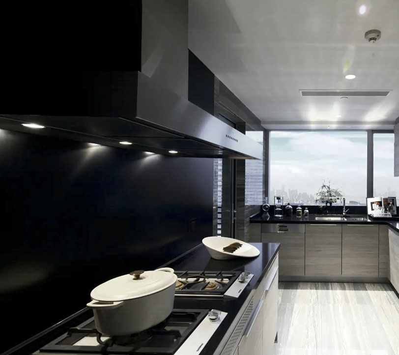 繞過餐桌,即見獨(dú)立U形廚房,充分參考人體工程學(xué),配備世界TOP廚電品牌。昂貴的Gaggenau嘉格納八件套(抽煙機(jī)、3燃?xì)忸^的燃?xì)庠睢⒈?、帶消毒功能洗碗柜、蒸烤爐一體機(jī)、酒柜、咖啡機(jī))、國(guó)際櫥柜品牌及人性化配置(廚房空調(diào)),帶來(lái)奢華的享受