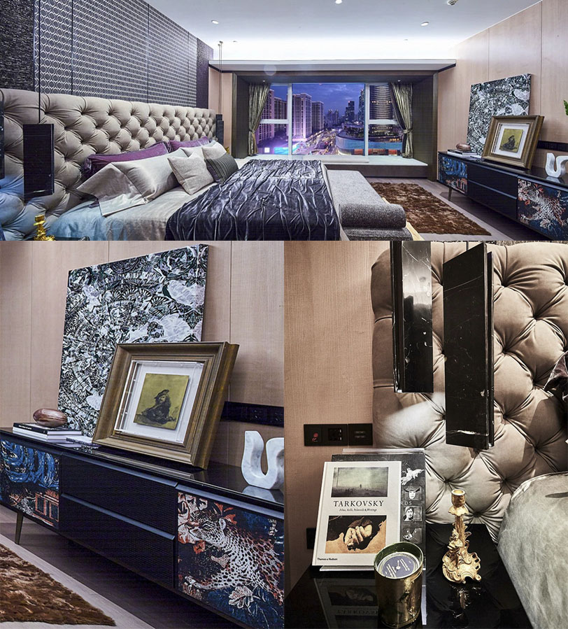推開書房的另一道門,即見別有洞天的一間套臥,臥室灰色暗紋理的墻紙與書房的同色墻紙同呼吸,冷冽高貴一以貫之