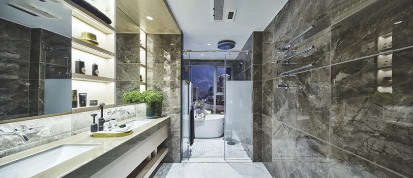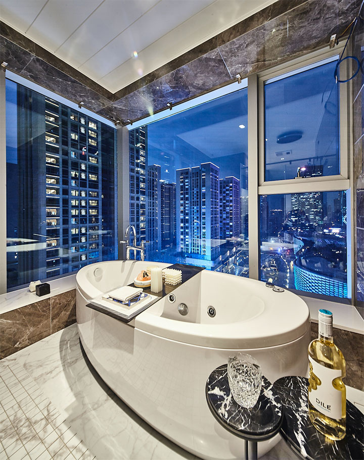 深圳中心天元、崗廈天元花園、270度轉(zhuǎn)角浴缸,室外是伸手可觸摸的大都會(huì)繁華與精彩,室內(nèi)是可觸摸的國(guó)際高貴與時(shí)尚氣息。盥洗間浴缸、馬桶、水龍頭、花灑等皆使用國(guó)際奢侈大品牌,其中主臥浴缸為世界第一個(gè)軟體浴缸締造品牌卡力仕,使用了宇宙飛船及火箭上的耐熱保護(hù)層技術(shù),“遇熱水即軟如沙發(fā)”,與瑞吉酒店總統(tǒng)套房同款