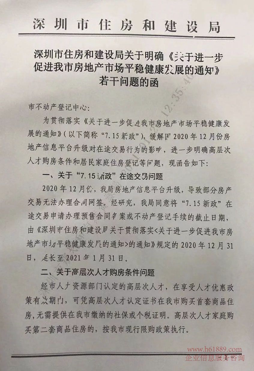 2021年1月19日,深圳市住建局發(fā)布《關(guān)于進(jìn)一步促進(jìn)我市房地產(chǎn)市場(chǎng)平穩(wěn)健康發(fā)展的通知》若干問題的函,對(duì)“7. 15新政”在途交易問題、高層次人才購房條件問題、居民家庭住房登記問題作出進(jìn)一步明確。