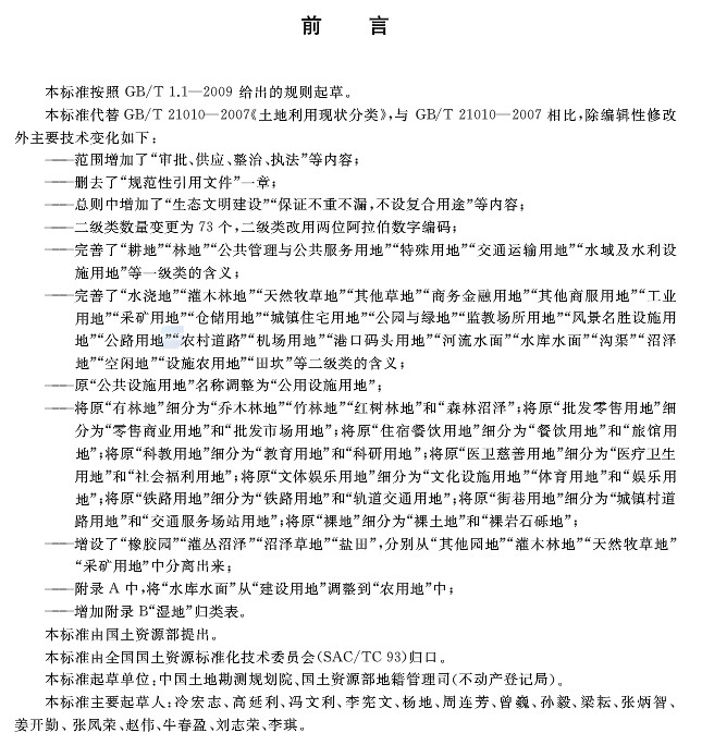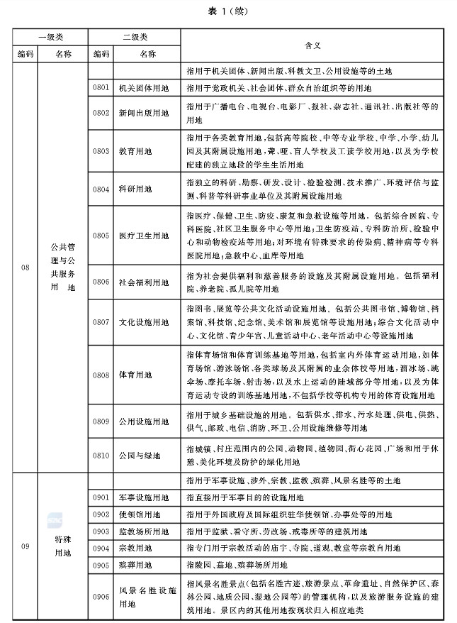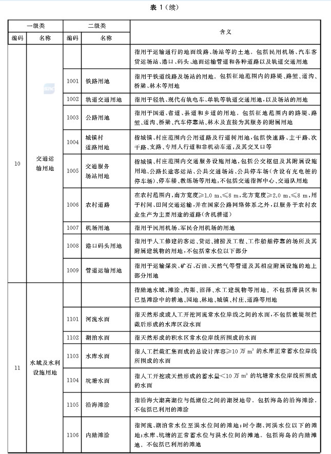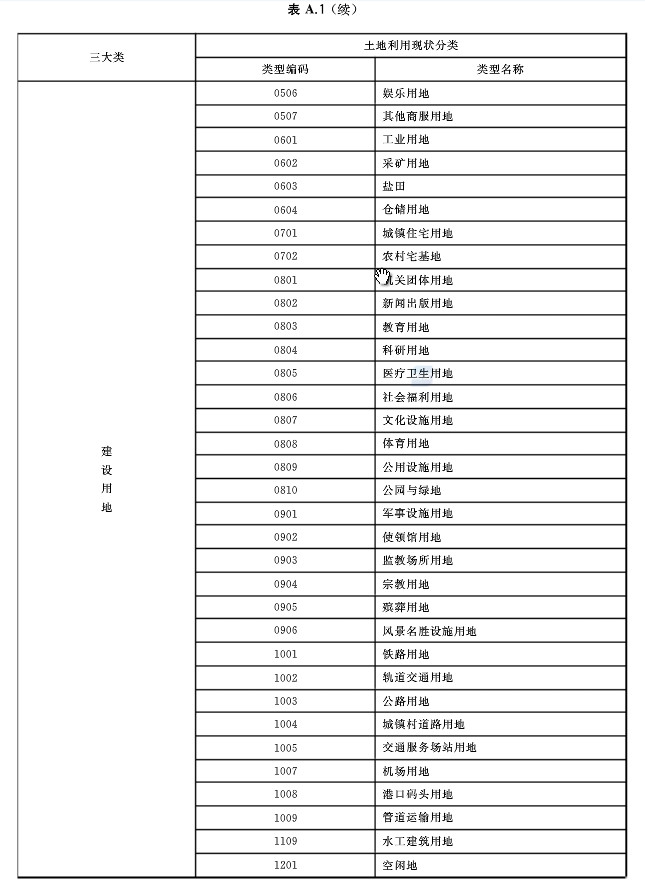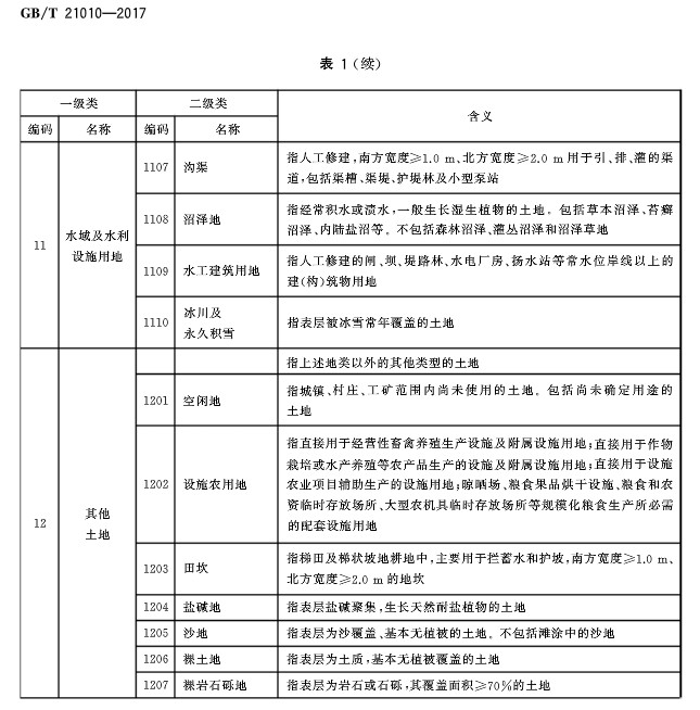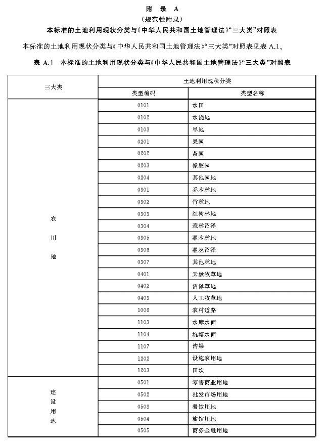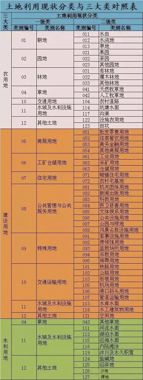 《土地利用現(xiàn)狀分類》國(guó)家標(biāo)準(zhǔn)采用一級(jí)、二級(jí)兩個(gè)層次的分類體系,共分12個(gè)一級(jí)類、57個(gè)二級(jí)類。其中一級(jí)類包括:耕地、園地、林地、草地、商服用地、工礦倉(cāng)儲(chǔ)用地、住宅用地、公共管理與公共服務(wù)用地、特殊用地、交通運(yùn)輸用地、水域及水利設(shè)施用地、其他土地。
