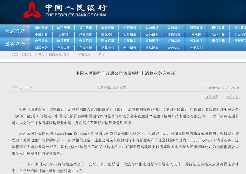 2020年6月13日,中國(guó)人民銀行官方微信發(fā)布消息,向連通公司核發(fā)銀行卡清算業(yè)務(wù)許可證!