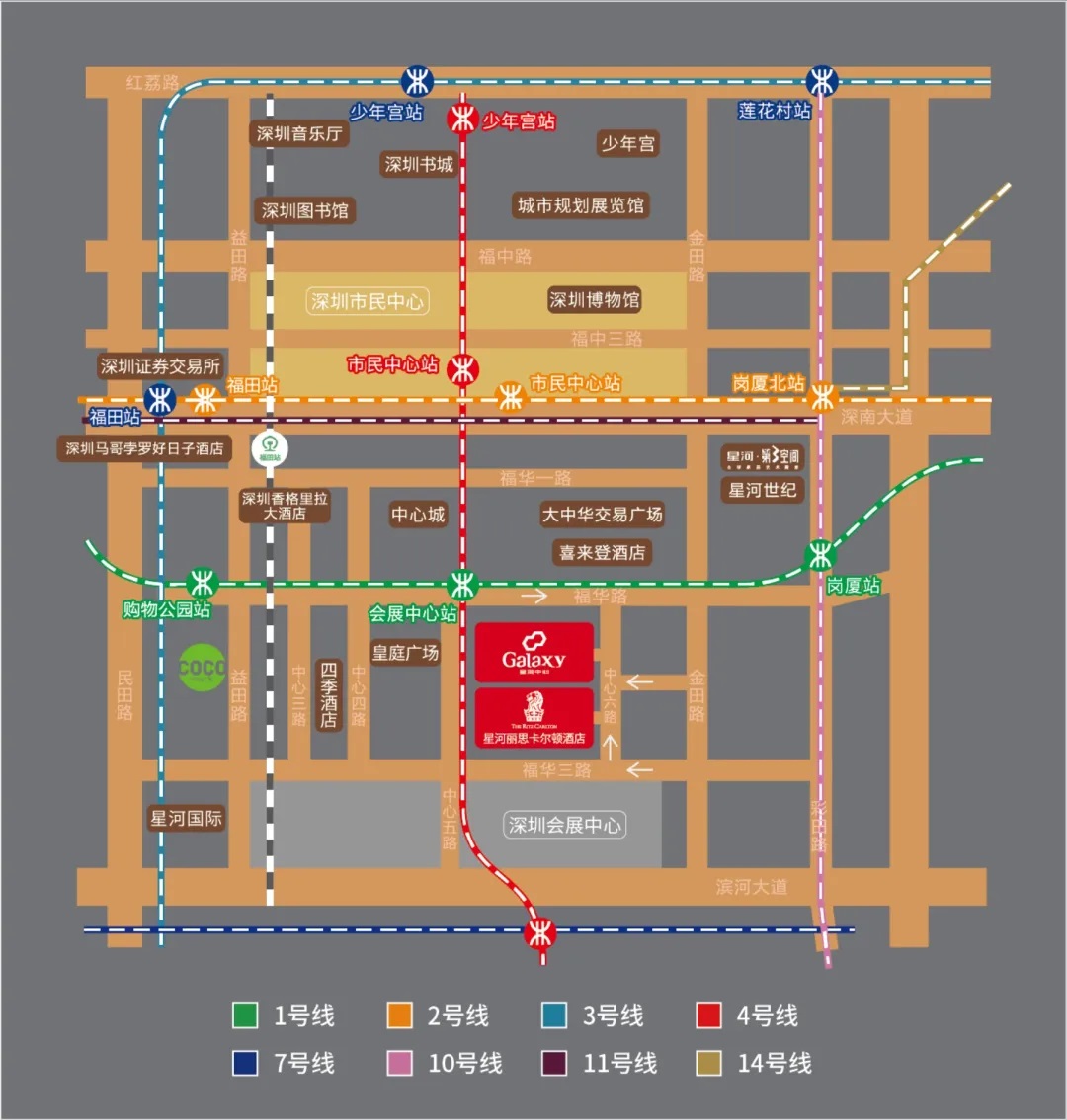 深圳星河中心與地鐵1號線【羅寶線】地鐵4號線【龍華線】會展中心站無縫對接:2站內(nèi)可換乘多條線路:構建全城半小時地鐵通勤圈:從地鐵口到寫字樓僅需20步:徹底告別堵車煩惱