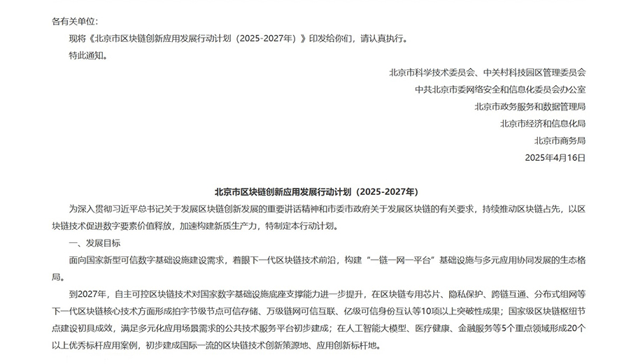 在全球數字化浪潮洶涌、Web3概念方興未艾之際,中國政府再次展現了其在區(qū)塊鏈技術領域的雄心與布局。近日,北京市多個核心政府部門聯合發(fā)布了一項名為《北京市區(qū)塊鏈創(chuàng)新應用發(fā)展行動計劃(2025–2027年)》的重要政策文件,清晰地勾勒出未來三年首都乃至全國在區(qū)塊鏈技術研發(fā)、基礎設施建設和產業(yè)融合應用的宏偉藍圖。這份計劃不僅將區(qū)塊鏈定位為“產業(yè)數字化的核心技術”,更在嚴格的加密貨幣禁令背景下,釋放出可能探索“數字資產”應用的微妙信號,引發(fā)市場高度關注