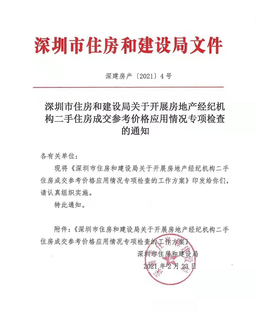 2021年2月23日,深圳住建局發(fā)布《深圳市住房和建設(shè)局關(guān)于開展房地產(chǎn)經(jīng)紀機構(gòu)二手住房成交參考價格應(yīng)用情況專項檢查的工作方案》。
