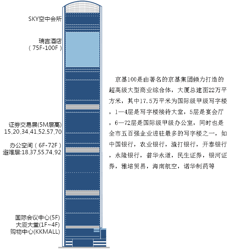 京基100【京基100大廈】是由著名的京基集團(tuán)傾力打造的超高級(jí)大型商業(yè)綜合體, 大廈總建面22萬平方米,其中17.5萬平米為國際級(jí)甲級(jí)寫字樓,1—4層是寫字樓接待大堂,5層是宴會(huì)廳,6—72層是國際級(jí)甲級(jí)辦公室,同時(shí)也是全市五百強(qiáng)企業(yè)進(jìn)駐最多的寫字樓之一,如中國銀行,農(nóng)業(yè)銀行,渣打銀行,開泰銀行,永隆銀行,普華永道,民生證券,銀河證券,雅培貿(mào)易,海南航空,諾華制藥等