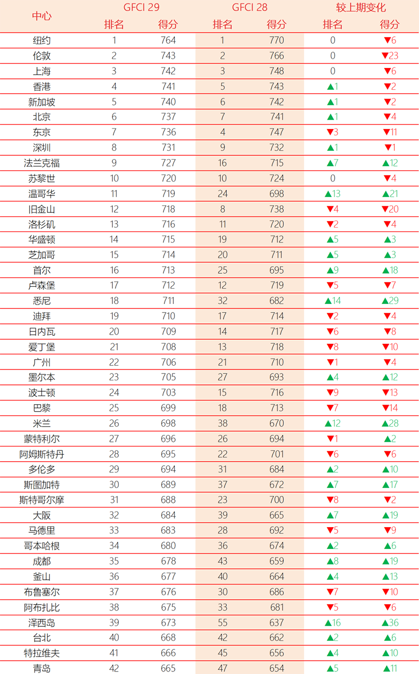 全球前十大金融中心排名依次為:紐約、倫敦、上海、香港、新加坡、北京、東京、深圳、法蘭克福、蘇黎世。深圳排名亞洲第六、全球第八,香港排名亞洲第二、全球第四,全球排名各較上一期上升了1位