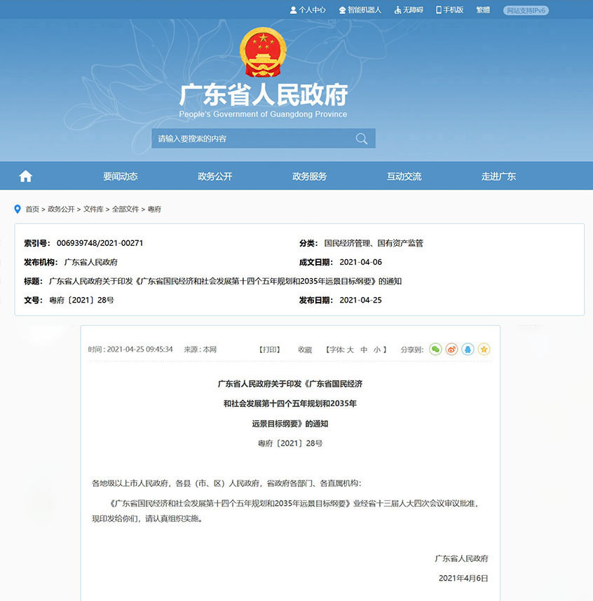 2021年04月25日,《廣東省國民經(jīng)濟(jì)和社會(huì)發(fā)展第十四個(gè)五年規(guī)劃和2035年遠(yuǎn)景目標(biāo)綱要》正式對(duì)外公布。據(jù)深圳夢(mèng)整理發(fā)現(xiàn):這份文件總共二十一章節(jié),195頁,信息量很大,是指導(dǎo)廣東未來5到15年發(fā)展的重要文件,清晰描繪了廣東“十四五”時(shí)期開啟全面建設(shè)社會(huì)主義現(xiàn)代化新征程的宏偉藍(lán)圖。提出創(chuàng)新強(qiáng)省、現(xiàn)代產(chǎn)業(yè)體系、現(xiàn)代化基礎(chǔ)設(shè)施體系、新型城鎮(zhèn)化和區(qū)域協(xié)調(diào)發(fā)展、民生福祉等18項(xiàng)重點(diǎn)任務(wù)和103個(gè)重大工程項(xiàng)目(工程包)。其中直接提到深圳及與深圳相關(guān)的雙區(qū)、深港、光明、河套、西麗湖國際科教城、軌道、交通等次數(shù)超140次,一口氣宣布了38個(gè)支持深圳