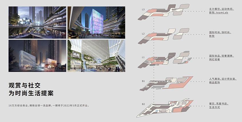 觀賞與社交為時(shí)尚生活提:1 6 萬(wàn)方綜合商業(yè),擁抱全球一流品牌,一期將于 2 0 2 2 年 5 月正式開業(yè)