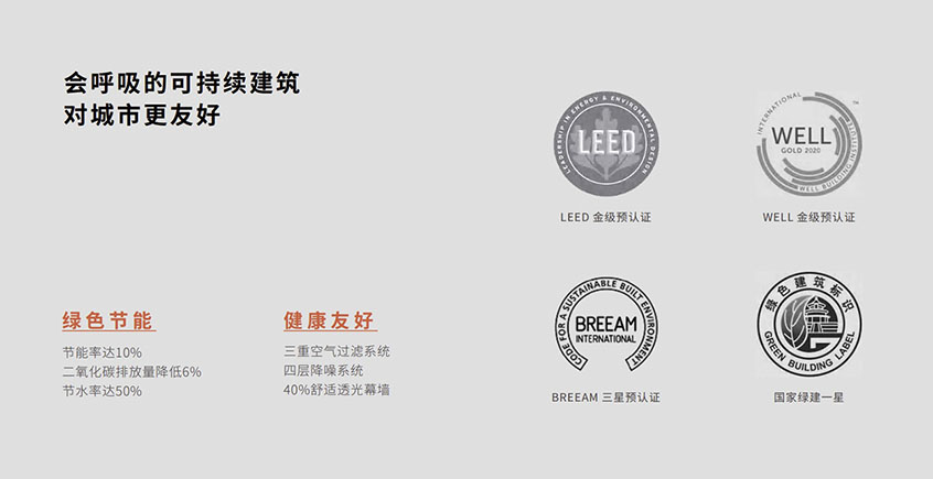LEED 金級(jí)預(yù)認(rèn)證、WELL 金級(jí)預(yù)認(rèn)證、BREEAM 三星預(yù)認(rèn)證、國(guó)家綠建一星